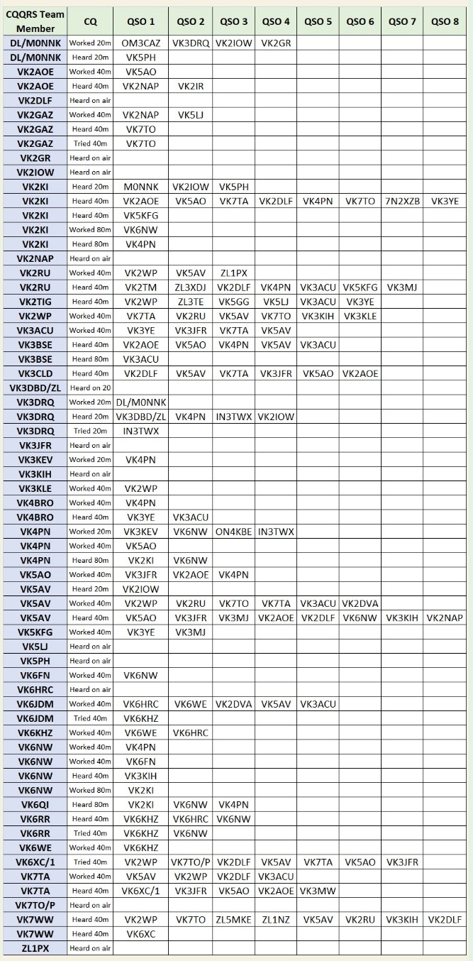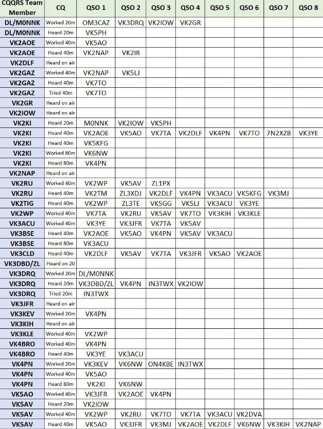 Thank you so much to our team of 32 contributors: MONNK, VK1HF, VK2A0E, VK2GAZ, VK2IOW, VK2RU, VK2TIG, VK2WP, VK3ACU, VK3BSE, VK3CLD, VK3DRQ, VK3KEV, VK3KLE, VK4AW, VK4BRO, VK4PN, VK5AO, VKSAV, VKSET, VKSKFG, VK6EN, VK6HRC, VK6JDM, VK6KHZ, VK6LD, VK6NW, VK6RR, VK6WE, VK6XC, VK7TA and VK7WW.
