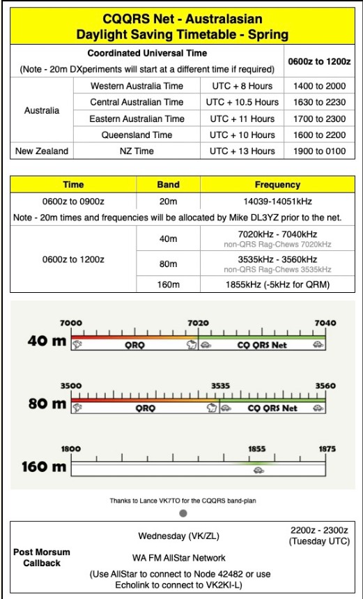 Everyone’s welcome – 3580KHZ at 7pm Eastern time every Wednesday; you’ll hear lots of the CQQRS team on that net. Jordan VK3ACU has recorded the complete set of lessons which you can now find here: