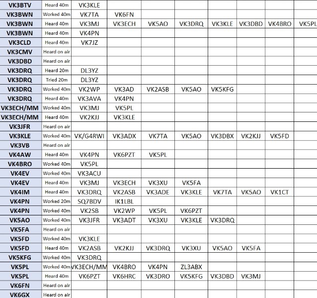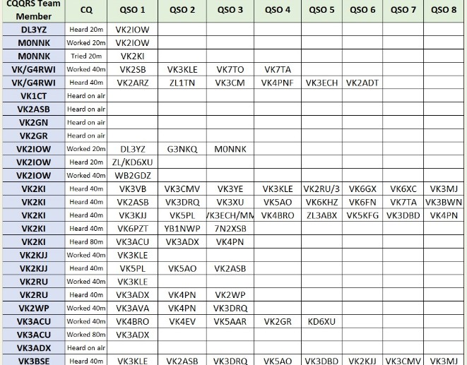 Thank you so much to our team of 40 contributors: DL3YZ, MONNK, VK/G4RWI, VKIAD, VK2KIJJ, VK2RU, VK2WF, VK2WP, VK3ACU, VKSBSE, VKSBTV, VK3BWN, VK3CLD, VK3DBD, VK3DRQ, VK3ECH/MM, VKSKLE, VK4AW, VK4BRO, VK4EV, VK4IM, VK4PN, VK5FD, VK5FR, VKSKFG, VK5PL, VK6FN, VK6HRC, VK6JDM, VK6KD, VK6KHZ, VK6LD, VK6NW, VK6WE, VK6XC, VK7UZ, VK7TA, WB2GDZ, ZLIPB and ZL3ABX.