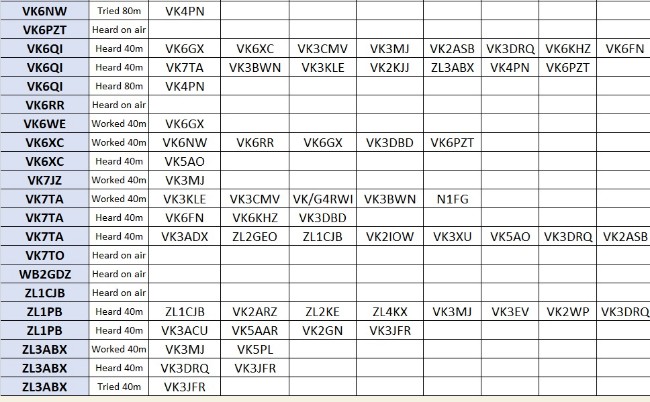I was really pleased to see receive-only reports from Phil ZL1PB, David VK6KD, Wayne VK6NW and Keiran VK3BTV; Keiran went so far as to advise that he couldn’t get on air because the-deg-ate-his homework his budgie had chewed through his keyer cord (sure it did Keiran!).