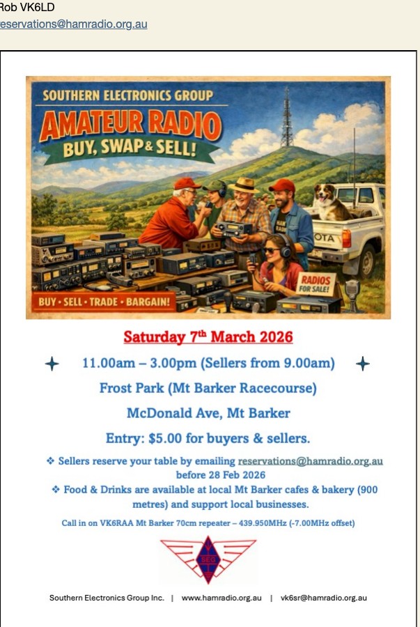 From Rob VK6LD Just a reminder that there is less than two weeks to go until the SEG Mt Barker Car Boot Sale — Saturday 7 March 2026. If you wish to request a sellers table, please do so before 28 February 2026. Look forward to seeing you there.