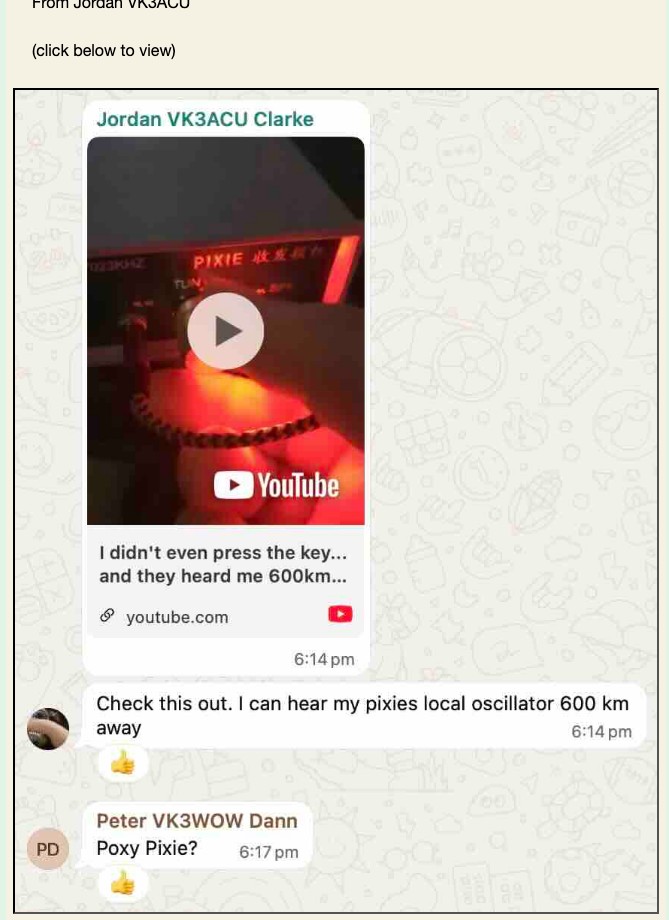 Jordan VK3ACU at Meredith (South of Ballarat) reports hearing his Pixie 40m transceiver’s local oscillator on Paul VK5PH‘s famous Ironstone Range KiwiSDR network, just East of Adelaide; see his YouTube report below.