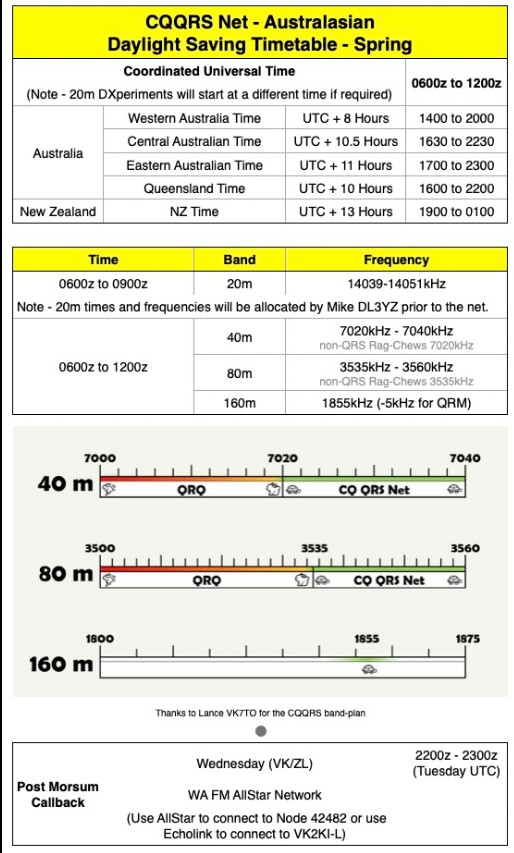Please let me know cqqrsnet@gmail.com and I’ll pass them to John VK2RU for compilation each week.]